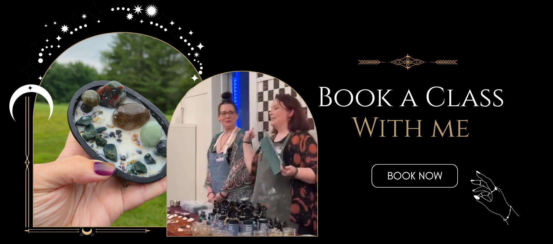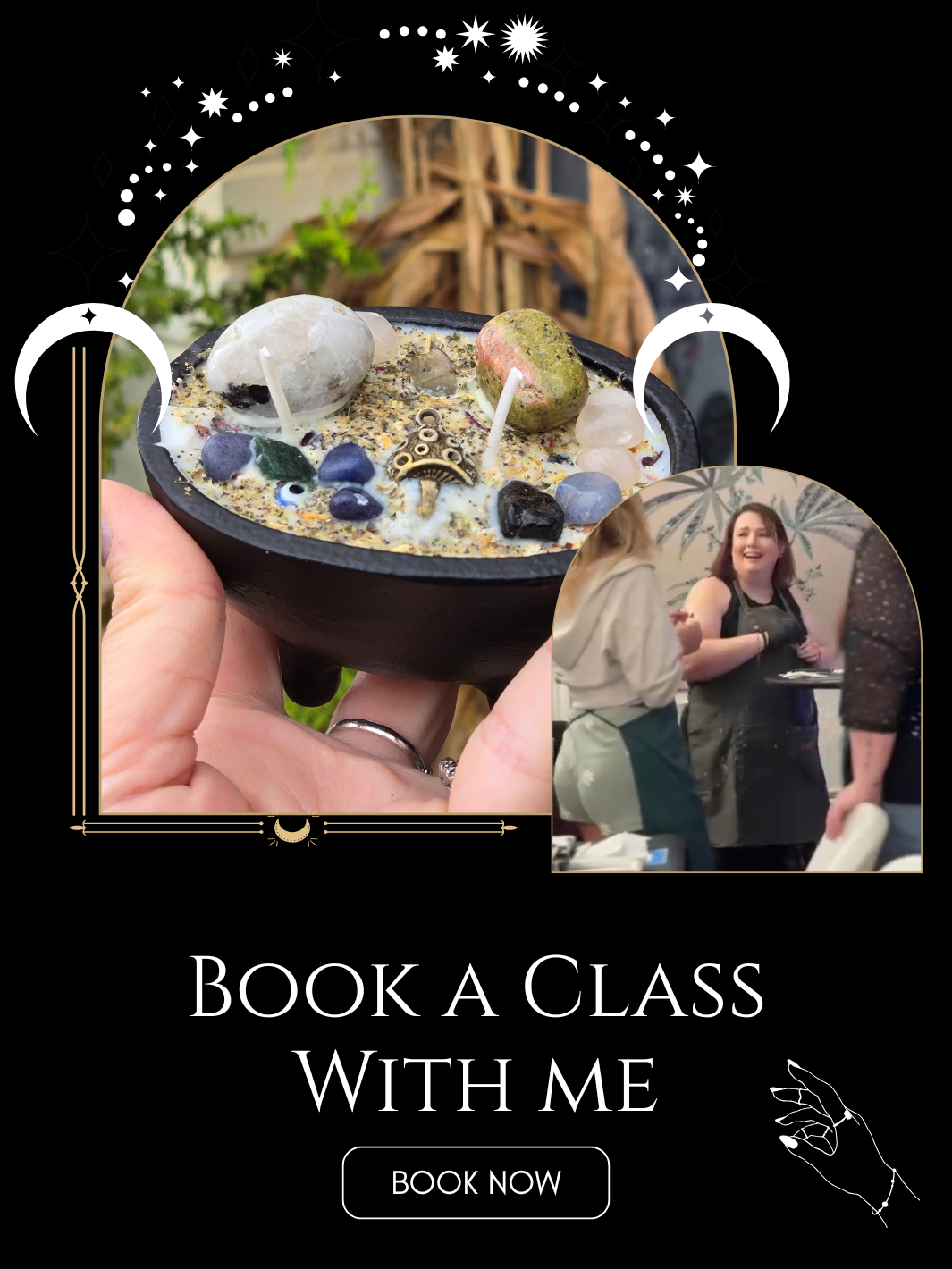 BOOK NOWThese classes are hands-on, a little chaotic, and very intentional. You’ll build your own cauldron intention candle from start to finish—choosing your scent, herbs, crystals, and purpose—while laughing, learning, and actually doing the work. No pressure, no perfection, and no “sit quietly and manifest” nonsense. Just a fun, welcoming space to create something powerful and leave with a candle you’re genuinely proud of.